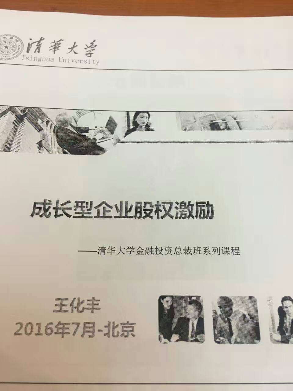 2016年07月24日,应清华大学企业研修中心之邀,在润千秋总裁俱乐部系列课程中,王化丰老师为来自全国60多位企业家,进行了股权激励课程讲解。王老师从三部分讲起,第一部分是股权激励概述、第二部分是股权激励解决方案、第三部分是股权激励案例。系统讲述的股权激励的意义、本质、工具方法,并结合案例进行了教学。