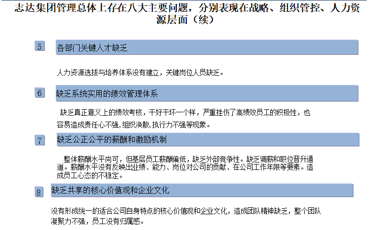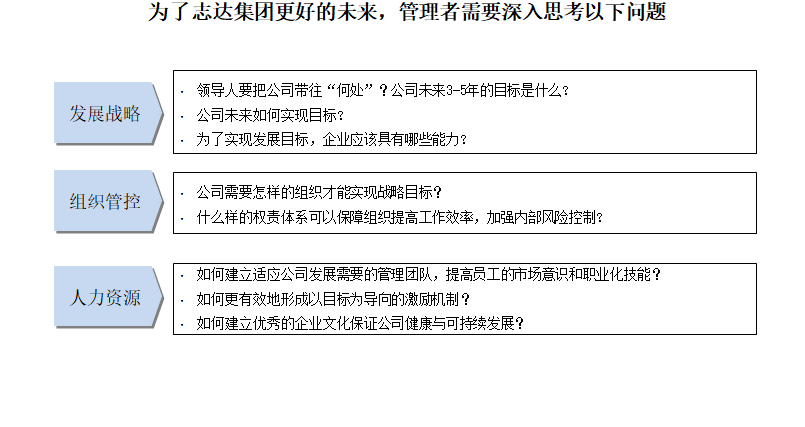 一、 2014年对志达集团进行全面访谈与调研整理问题如下(部分): 二、 通过近半年的咨询服务,咨询组帮助志达在组织系统建设方面进行了系统梳理和重建: